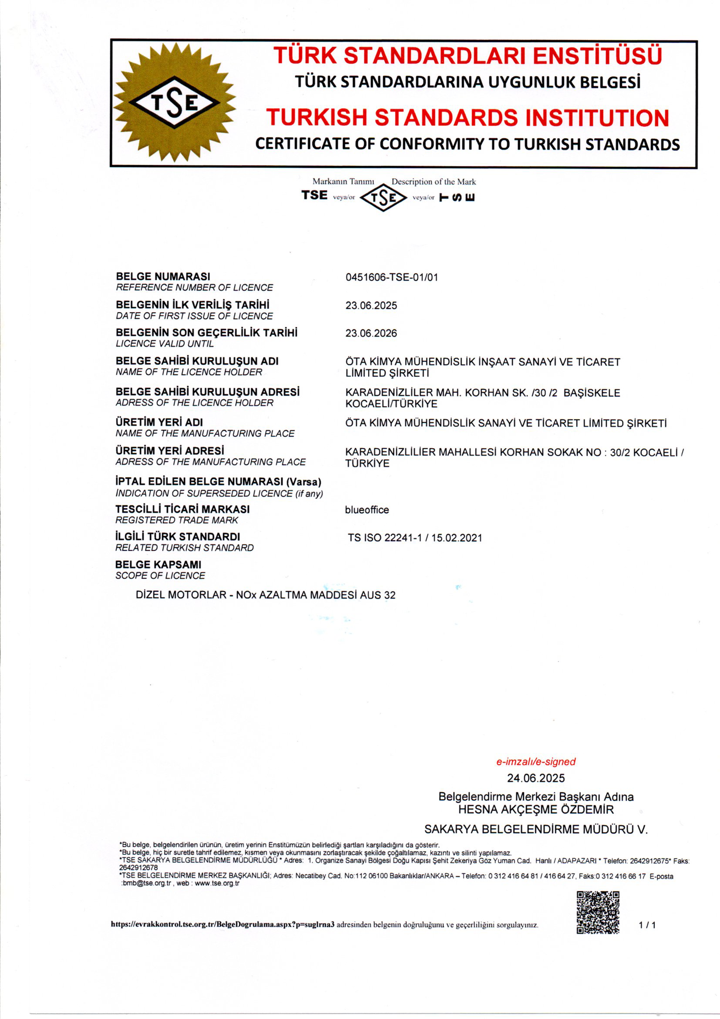 Belgeye aşağıdaki linkten ulaşabilirsiniz. http://www.blueoffice.tr/wp-content/uploads/2023/05/tse-belgesi.png